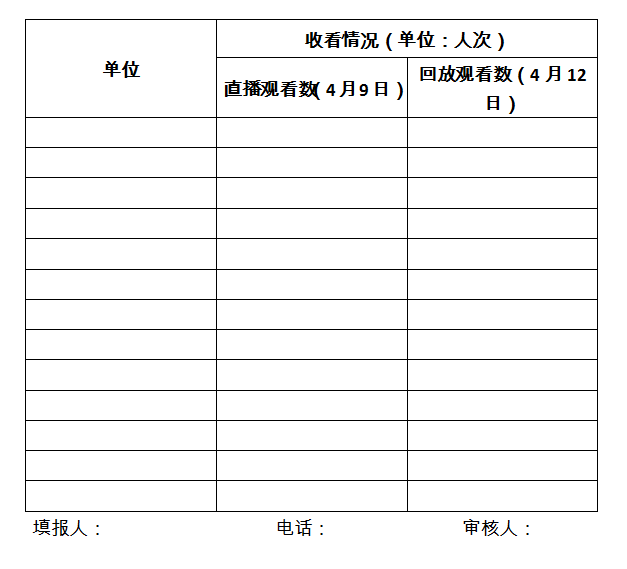 (三)加强反馈。各单位做好相关资料的收集和数据统计工作。学生群体收看由学生工作处、国际教育学院、里仁学院负责组织并反馈收看数据,教职工由各中层单位负责组织并反馈收看数据。请于4月10日17时、4月12日17时前,分别上报所负责师生观看直播和视频回放的有关数据。