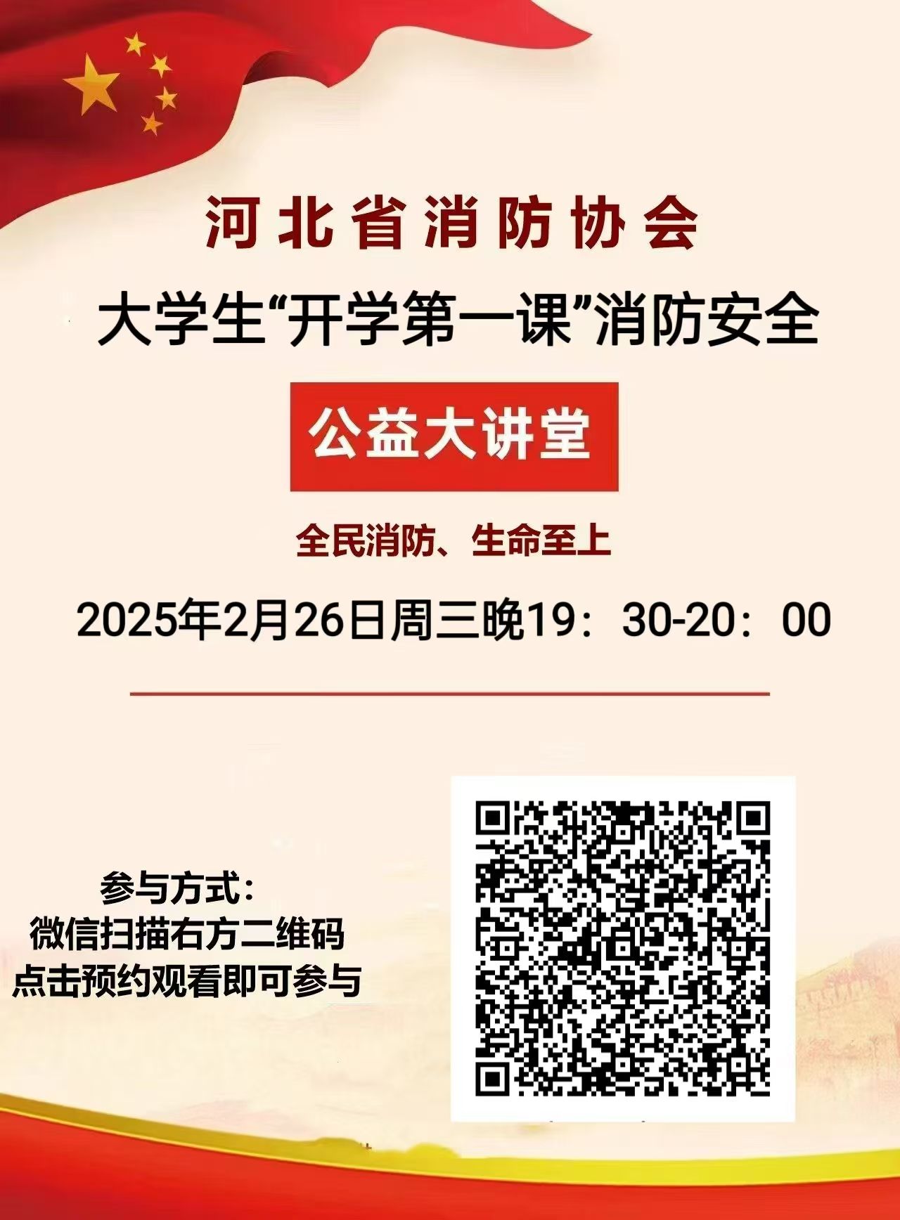 为了深刻吸取近期事故的教训,根据全省安全生产工作会议相关要求,做好春季开学安全教育,紧盯学生重点群体,宣传普及防灾、消防、交通、食品等各方面的安全知识和技能,切实提高师生的安全意识和自我保护能力,全力维护全省教育系统安全稳定和广大师生生命安全。本周,河北省消防协会以线上直播的形式针对在校学生开展校园“开学安全第一课”消防安全专题讲座,请各学院利用此次机会组织发动学生积极学习。