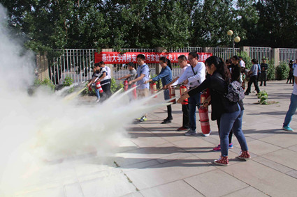 最后全体参训人员在室外进行了灭火实战演练。张参谋讲解了灭火器的使用方法和注意事项,并组织参训人员亲自体验,使用灭火器将预先设置的起火点的火扑灭。