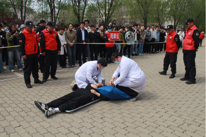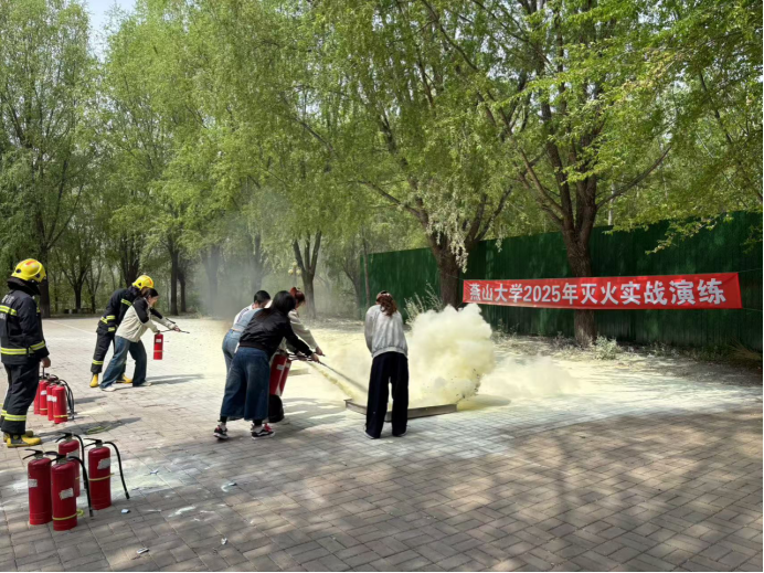 李春玲宣布“乌鸦传媒2025年春季学期人员密集场所灭火救援和应急疏散演练”开始。经管楼B区二楼师生休息室学生使用微波炉电线故障引起失火,“火情”发生后,休息室内学生拨打校园应急指挥中心报警电话,消防值班员在收到消防主机的火警警报后,立即前往经管楼B区二楼的师生休息室确认火情,消防值班员与现场的老师一分钟内形成第一灭火战斗力量使用灭火器扑救起火,与此同时,广播系统发布疏散指令,各楼层辅导员迅速引导师生用湿毛巾捂住口鼻,沿安全通道低姿撤离至室外安全区。就近的微型消防站队员携带灭火救援装备在3分钟内形成第二战斗力量,到达现场灭火救援,在起火室内及周围进行搜救并使用室内消火栓继续灭火,因室内烟雾太大火势猛烈,灭火救援失败,队员被迫撤离至安全区域,接应消防救援人员到达。辖区消防中队接警后,3辆消防车抵达现场,内攻灭火、外部控火,利用登高车成功营救“被困”学生,“大火”也被彻底扑灭。校医院医护人员对“伤员”现场急救,演示了心肺复苏、烧伤包扎的急救措施。
