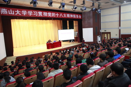 陈春利副书记在主持报告会时指出,摆在全校师生员工面前的首要政治任务,就是学习好、领会好、宣传好、贯彻好、落实好党的十八大精神,自觉把思想和行动统一到党的十八大精神上来,把智慧和力量凝聚到学习贯彻党的十八大提出的各项任务上来。为贯彻落实好党的十八大和学校第三次党代会精神,校党委委托马克思主义学院和经济管理学院结合我校自身情况对党的十八大报告作了专题研究,并最终以系列讲座的形式供全体党员干部学习,在校内掀起传达学习宣传贯彻党的十八大精神的高潮。